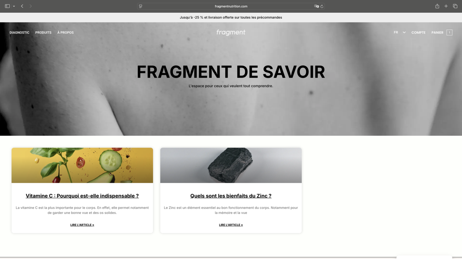 Enfin, un blog dédié, « Fragment de Savoir », a été intégré pour accompagner la stratégie de contenu et renforcer la dimension éducative de la marque, en partageant des ressources autour de la nutrition, des compléments alimentaires et de la santé. Levier indispensable pour le référencement naturel.